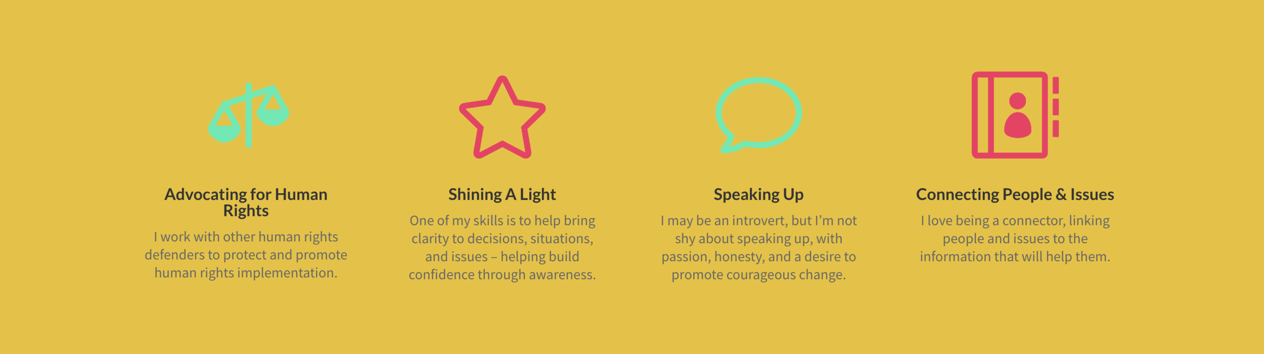 I’m one of those people who grew up wanting to change the world. And I’m doing it — I’m a human rights advocate and international law specialist. I work with courageous individuals and communities.